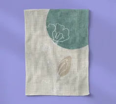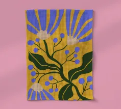 Un ramo stilizzato con foglie e bacche si staglia su uno sfondo astratto di forme blu, verdi e gialle. Le forme fluide e le morbide sfumature di colore danno un senso di armonia e di calma.