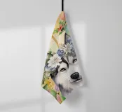 Un ritratto in stile acquerello raffigura un cane husky con una corona di fiori. Il cane ha una pelliccia bianca e nera e un'espressione dolce. La corona di fiori è composta da fiori bianchi e blu con foglie verdi. Lo sfondo è pieno di fiori colorati nelle tonalità del rosa, dell'arancione e del giallo, che creano un'atmosfera vibrante e allegra. Dietro il cane e i fiori è visibile la cornice di una finestra.