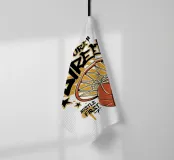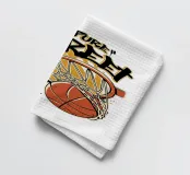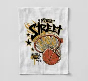 Design urbano del basket con tipografia graffiti, tavolozza arancione e nera e canestro in rete. Uno stile street distintivo per abbigliamento sportivo e casual.