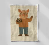 Aggiungete un tocco morbido e caldo al vostro arredamento con questo poster che raffigura un simpatico maialino occhialuto con un maglione arancione che tiene in mano una macchina fotografica.