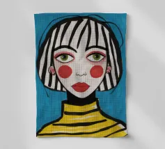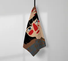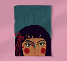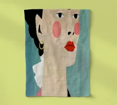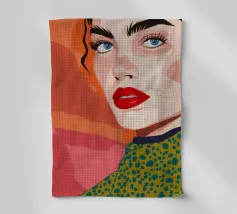 Un ritratto grafico di grande impatto di una donna con un'acconciatura nera e labbra rosse, con lo sguardo intenso rivolto all'osservatore, su uno sfondo colorato e astratto.