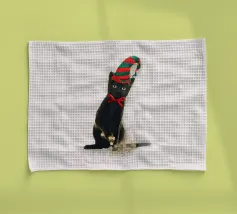 Un gatto nero che indossa un cappello da Babbo Natale è spiritosamente impigliato in luci natalizie colorate. Il testo accanto al gatto recita: "È abbastanza allegro?".