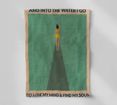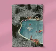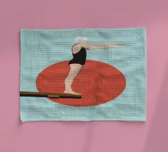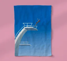 Donna che fotografa un uomo in procinto di saltare in piscina. Cielo aura sfumato e citazione 'Non è così profondo'. Surreale design retrò con piscina di motel vintage di MsGonzalez