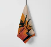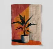 Un vibrante dipinto a olio raffigurante una pianta tropicale in vaso, ricco di toni caldi e contrasti decisi. I rossi profondi, gli arancioni e le tonalità dorate evocano calore e vitalità, mentre le pennellate strutturate aggiungono profondità e drammaticità a questa composizione lussureggiante in un interno vintage e all'avanguardia.