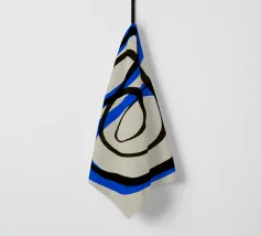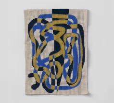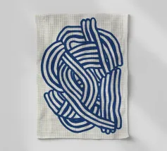 Una spessa linea blu serpeggia su uno sfondo neutro, creando un motivo astratto dalle forme audaci e curvilinee. La semplicità del disegno enfatizza il movimento e il flusso della linea continua.