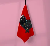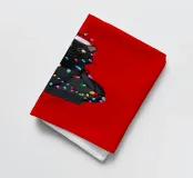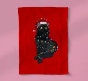 Adorabile gatto nero impigliato in luci natalizie colorate: un'illustrazione festiva e divertente per gli amanti dei gatti e dell'arredamento accogliente.