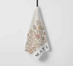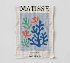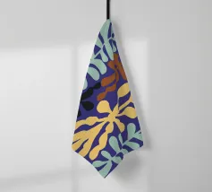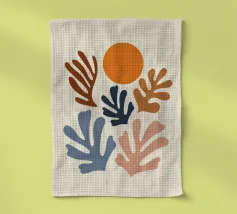 Un motivo di foglie stilizzate nei toni del verde, del rosa e della terracotta, ispirato ai ritagli di Henri Maraoui. La disposizione suggerisce una danza aggraziata di forme botaniche.