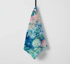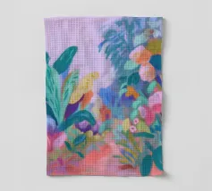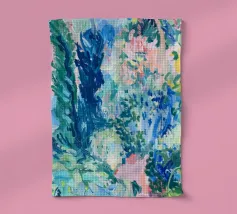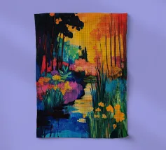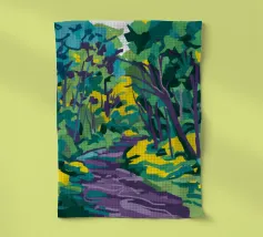 Un sentiero che attraversa un giardino all'inglese, circondato da una vegetazione vivace e da fiori sbocciati nei toni del rosa, del viola, del blu, del giallo e del verde acqua, dipinti con audaci pennellate di pittura acrilica, creando una scena vibrante e colorata che ricorda lo stile di Matisse. I colori sono brillanti e saturi e aggiungono profondità alla composizione, mentre le ombre morbide aggiungono dimensione a elementi come alberi, fogliame, cespugli e rocce. Questo dipinto evoca gioia e giocosità, creando un effetto allegro.
