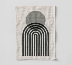 Opera d'arte geometrica minimalista con linee nere e un semicerchio di colore marrone con texture, su uno sfondo beige neutro e morbido. Opera d'arte astratta con texture morbide per gli stili di interni Bohemien, Moderno, Industriale e Basic. Bella per il soggiorno, lo studio e l'ufficio.