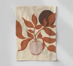 Il design minimalista è caratterizzato da una semplice pianta in vaso con foglie scure, contrapposta a forme astratte e sovrapposte nei toni terrosi del rosso, del grigio e del bianco. Le linee pulite e i blocchi di colore decisi creano un'estetica moderna e rilassante.