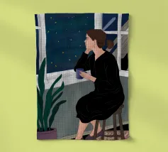 Una donna dai capelli ricci e castani siede a un tavolo con una tazza di caffè e un vaso di fiori rossi. Il caldo ambiente interno evoca relax e fascino intimo.