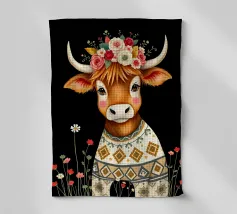 Simpatiche mucche scozzesi stravaganti in un prato selvaggio con copricapi floreali.