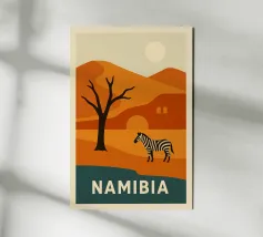 Un poster dai toni infuocati per una terra selvaggia. La Namibia, le sue dune arancioni, le zebre in libertà e gli alberi pietrificati prendono vita in una composizione suggestiva e stilizzata. Ideale per un arredamento potente, che combina natura estrema e bellezza grafica. Ogni curva racconta la storia dell'Africa.