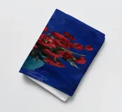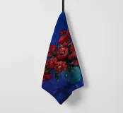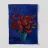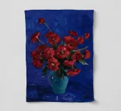 Un bouquet di fiori rosso cremisi risplende su uno sfondo indaco scuro, creando un contrasto drammatico, una natura morta notturna e romantica.