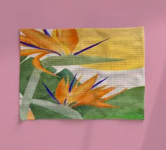 Un'illustrazione splendidamente dettagliata cattura l'eleganza di un'orchidea in fiore, con vibranti petali rosa, bianchi e gialli contrapposti a foglie blu intenso.