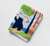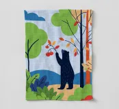 Godetevi la bellezza della natura selvaggia con questa illustrazione di un orso che raccoglie frutta in una tranquilla foresta. I colori vivaci e il design minimalista creano un'atmosfera pacifica e rasserenante.