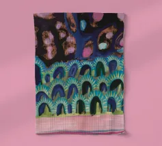 Un dipinto di paesaggio astratto caratterizzato da bande orizzontali di blu intenso nella parte superiore, che passano a gialli, rosa e arancioni, con un primo piano strutturato che suggerisce un campo o un fitto fogliame sotto un cielo vibrante.