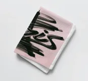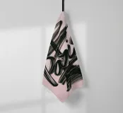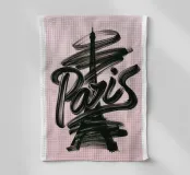 Questo poster moderno presenta la Torre Eiffel leggermente delineata dietro pennellate calligrafiche nere e dinamiche che scrivono "Paris" su uno sfondo rosa tenue.
