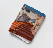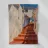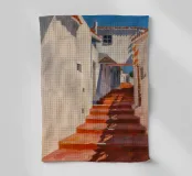 Uno stretto passaggio illuminato dal sole tra edifici bianchi è caratterizzato da una serie di scale rosso cremisi che creano una composizione audace, grafica e architettonicamente interessante, ricca di fascino mediterraneo.