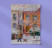 Una persona porta a spasso il proprio cane lungo una strada innevata fiancheggiata da edifici storici in brownstone, catturando un momento di calma e tranquillità della vita urbana in pieno inverno.