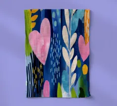 Un patchwork allegro e commovente di piante stilizzate, motivi vivaci e un grande cuore affettuoso. Questa opera d'arte eclettica è una gioiosa celebrazione dell'amore, della crescita e della bellezza artigianale.