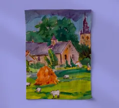 Un pittoresco paesaggio autunnale che raffigura un villaggio o una fattoria adagiata su una collina, circondata da un mosaico di alberi colorati nei toni dell'arancione e del giallo e da campi coltivati, con le lontane montagne blu a completare la scena.