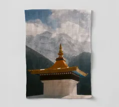 Un sentiero sterrato si snoda attraverso un campo aperto verso un piccolo villaggio himalayano, annidato alla base di imponenti montagne innevate. Due escursionisti si dirigono verso l'insediamento, il loro viaggio è incorniciato da un terreno accidentato e dal vasto cielo sovrastante. Il contrasto tra le tonalità della terra in primo piano e le cime ghiacciate sullo sfondo evidenzia la cruda bellezza della regione dell'Annapurna.