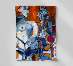 Questa complessa stampa picassiana presenta una composizione astratta con forme umane e animali frammentate, in particolare un uccello ed elementi che ricordano un volto e delle mani. Realizzata con linee decise e un'impressionante tavolozza di blu, grigi e arancioni, l'opera d'arte evoca un senso di movimento dinamico e di realtà decostruita. Il gioco di forme geometriche e curve organiche crea una narrazione visiva stimolante, caratteristica delle influenze cubiste e surrealiste. Questo poster digitale di alta qualità (7000x5000 pixel, 300 dpi) cattura magnificamente la profondità intellettuale e il genio artistico dell'artista.