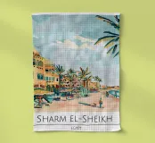 Questo vivace poster in stile retrò cattura il fascino solare della spiaggia di Sharm El-Sheikh. L'opera d'arte presenta una scena vivace con una splendida architettura costiera, palme lussureggianti e persone che si rilassano sulla spiaggia. Il mare turchese e le spiagge sabbiose sono resi con uno stile artistico dinamico e colorato, che evoca un senso di calore e di beatitudine vacanziera. La palette di colori caldi e invitanti e le pennellate fluide conferiscono all'immagine un'atmosfera unica e accattivante. Questo poster digitale di alta qualità (7000x5000 pixel, 300 dpi) è un'opera d'arte di prima qualità che celebra l'atmosfera serena e bella di questa spiaggia.