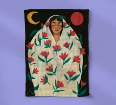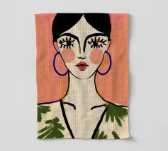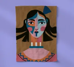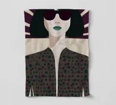 Il dipinto raffigura una persona con capelli corti e scuri acconciati a onde, che indossa un abito con motivi retrò e cerchi e diamanti nei toni del rosa, del marrone e del beige. Lo sfondo è di un semplice colore beige chiaro.