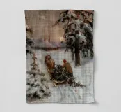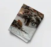 Un suggestivo dipinto invernale mostra un uomo che viaggia nella neve alta con la sua slitta trainata da cavalli, carica di abeti appena abbattuti. Sullo sfondo, la luna risplende dolcemente su una capanna coperta di neve. La scena irradia tranquillità, nostalgia e il calore delle giornate invernali rurali. Perfetto per gli amanti dell'arte invernale classica, delle decorazioni natalizie o dei murales festivi, questo motivo cattura la bellezza e la tranquillità di un paesaggio invernale innevato.