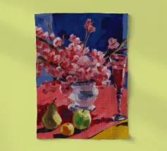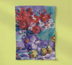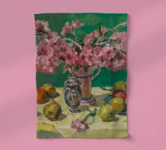 Una sontuosa natura morta presenta una teiera d'argento, una tazza di tè, una ciotola di frutta, tra cui mele e bacche, e un vivace bouquet di fiori, tutti riccamente colorati e strutturati, su un tavolo.