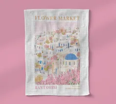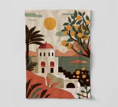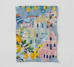 Una scena pittoresca di Santorini è caratterizzata da iconici edifici bianchi con cupole blu e una porta blu vibrante, che si affaccia sul mare scintillante sotto un cielo limpido con uccelli, incarnando il fascino idilliaco dell'isola greca.