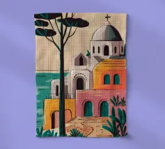 Una pittoresca illustrazione degli iconici edifici bianchi e delle cupole blu di un'isola greca, probabilmente Santorini, affacciata sul mare. La scena è una perfetta rappresentazione, inondata di sole, di un paradiso mediterraneo.