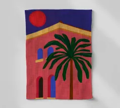 Scale rosse e vivaci conducono verso l'alto passando davanti a una finestra che rivela un cielo soleggiato, una palma e un sole splendente, a simboleggiare un viaggio verso una destinazione gioiosa.