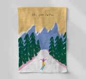 "Ski you later" - un gioco di parole tipografico incontra una colorata illustrazione invernale. Uno sciatore scivola rilassato lungo una pista bianca, circondato da abeti scuri e montagne viola. Il cielo si illumina di un caldo giallo pastello e conferisce alla scena un accenno di tramonto. Questo poster combina gli sport invernali con l'umorismo e una varietà di colori: un allegro richiamo per tutti gli amanti dello sci e della montagna.