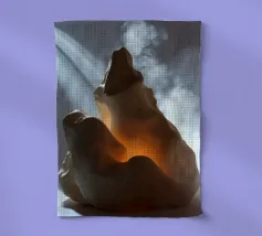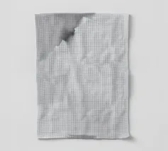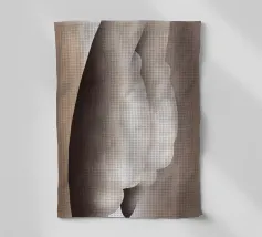 Una rappresentazione monocromatica presenta una forma accartocciata che ricorda in qualche modo una montagna o una formazione rocciosa. Le ombre e le lumeggiature sono state utilizzate per dare alla forma un aspetto tridimensionale, e poggia su uno sfondo più scuro che ne esalta la silhouette.