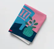 Un'affascinante ed eccentrica natura morta con una pianta in vaso appoggiata su una sedia blu brillante. La composizione è semplice ma piena di carattere, con colori vivaci e uno stile giocoso.