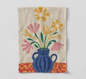Un'illustrazione semplice e affascinante di un bouquet di margherite colorate e stilizzate in un vaso blu, su una superficie a scacchi rossi e bianchi. L'opera d'arte emana un senso di pura e semplice gioia e fascino rustico.
