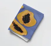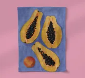 Una natura morta semplice ed elegante di una papaya tagliata a metà su un piatto blu intenso. La composizione minimalista e il sorprendente contrasto cromatico tra il frutto arancione e il piatto blu creano un pezzo moderno e sofisticato.