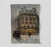 Un romantico paesaggio urbano dal sapore invernale: una carrozza nera trainata da cavalli si ferma nella neve fresca davanti a un magnifico edificio antico con finestre illuminate in modo caldo. Due persone elegantemente vestite sono impegnate in una conversazione, mentre i lampioni gettano una luce dorata sulla strada innevata. La scena racconta di un'epoca passata, dell'eleganza e della tranquilla bellezza di una serata innevata in città.
