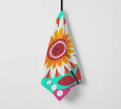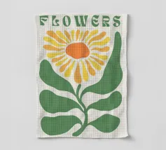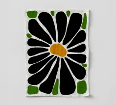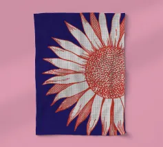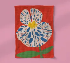 Un'illustrazione audace e grafica di un singolo grande fiore, probabilmente un anemone, con petali a strisce bianche e blu e un centro giallo. Lo sfondo rosso brillante rende il fiore il fulcro assoluto di questo pezzo potente.