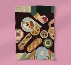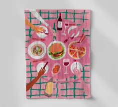 Una vista dall'alto di mani che condividono un grande piatto di spaghetti su una tovaglia a scacchi rossi e bianchi. La scena è una rappresentazione classica, gioiosa e un po' caotica di un pasto comune italiano.