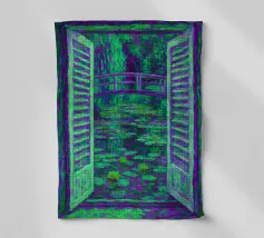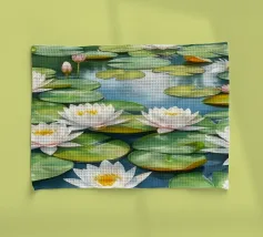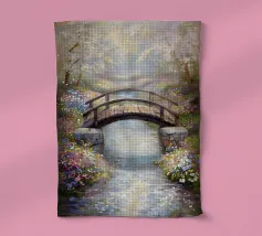Disegno a pastello di un ponte con laghetto di ninfee sottostante.