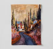 Una strada tortuosa fiancheggiata da alti cipressi è immersa nella calda luce dorata del crepuscolo; lo stile espressivo e pittorico crea un viaggio sognante e romantico attraverso la campagna.
