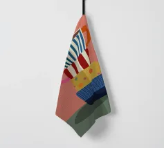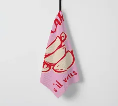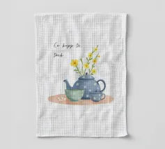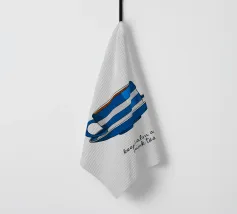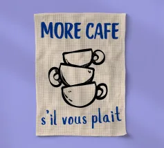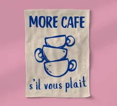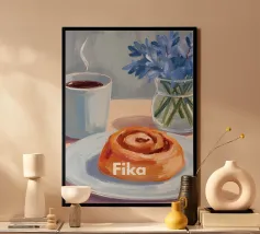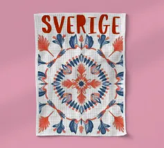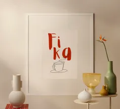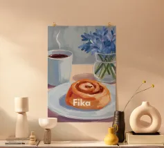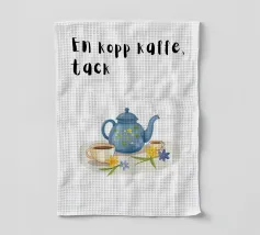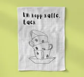 Diverse tazze di caffè sono giocosamente impilate l'una dentro l'altra e formano un motivo armonioso e minimalista. Compare anche la scritta svedese "en kopp kaffe, tack" ("una tazza di caffè, per favore"). La combinazione è calda, invitante e tipicamente scandinava.