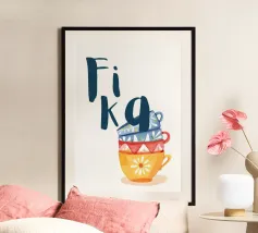 Diverse tazze di caffè sono giocosamente impilate l'una dentro l'altra e formano un motivo armonioso e minimalista. Compare anche la scritta svedese "en kopp kaffe, tack" ("una tazza di caffè, per favore"). La combinazione è calda, invitante e tipicamente scandinava.