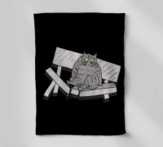 Un disegno divertente mostra un gatto grigio seduto su una panchina rotta nel parco. L'illustrazione ricrea la scena con un tocco comico, esagerando l'espressione del gatto. È come se il peso del gatto avesse causato l'incidente, creando una scena divertente e ironica.