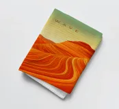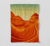 Disegno di viaggio minimalista e decorativo con "The Wave", la colorata formazione rocciosa sulle pendici del Coyote Buttes in Arizona, USA. Un disegno per le vacanze estive per tutti coloro che amano andare in vacanza nei parchi nazionali degli Stati Uniti e trovano bella questa natura e il paesaggio rossastro.