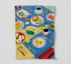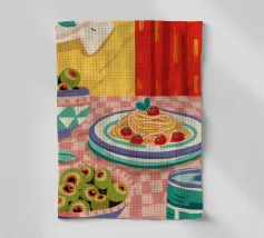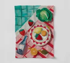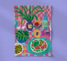 Vista dall'alto di un'insalata di pomodori freschi e di un bicchiere di vino su una tovaglia verde a righe all'aperto. La luce del sole e le ombre lunghe creano una scena vibrante, fresca e bella di una cena estiva.